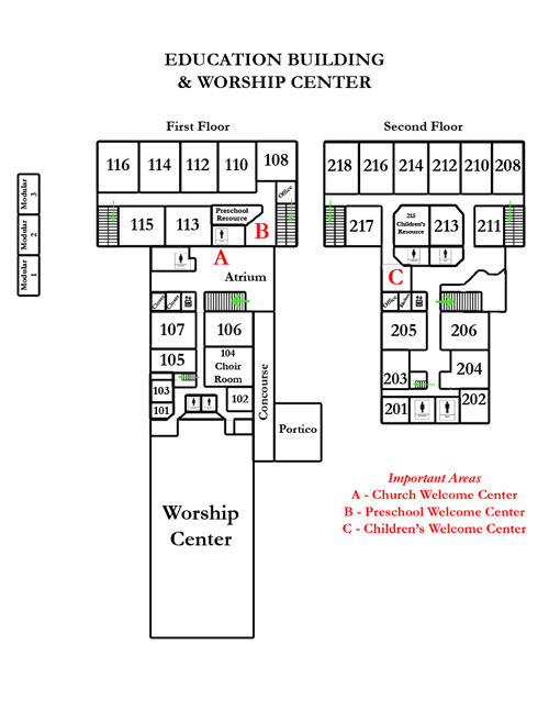 This is the newer section on our campus. If you are new, we invite you to park in a designated "guest" parking space near the entrance of the Atrium. In the Atrium you will find our Welcome Desk (point A on the map) where you can find more information about LifeGroups and activities for children.